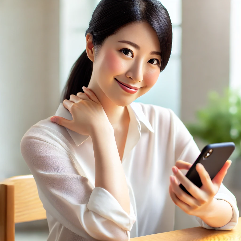 📱 고개를 숙이고 스마트폰을 사용하는 습관은 목주름을 심화시키는 가장 큰 원인 중 하나입니다.